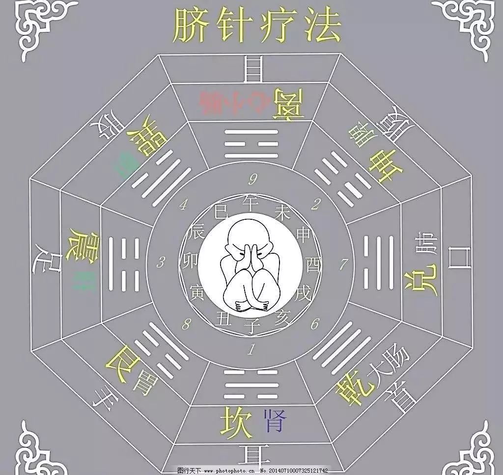 这种方法是利用易学中的后天八卦图在肚脐上定位,然后施针的。将人体脐部看作一个后天八卦图,将脐蕊为中心向四周八个方位对应八卦的方位。就此方位将上、下、左、右、左上、左下、右上、右下分别按后天八卦定下离、坎、震、兑、坤、乾、巽、艮八个方位,并通过取类比象的方法得到的八卦方位与人体的对应关系,而找出相应的疾病对应关系,然后进行治疗。比如呼吸系统的疾病,我们一般取兑位(即右位),就是将针在脐部的右壁刺入,方向朝外,呈放射状,留针数分钟。如肝病则取震位(即左位),就是这样简单。
