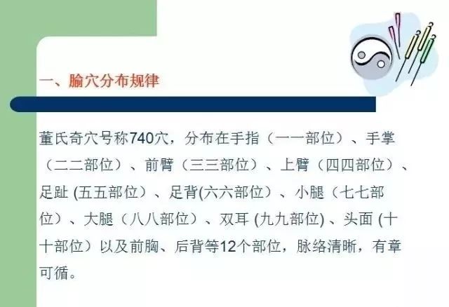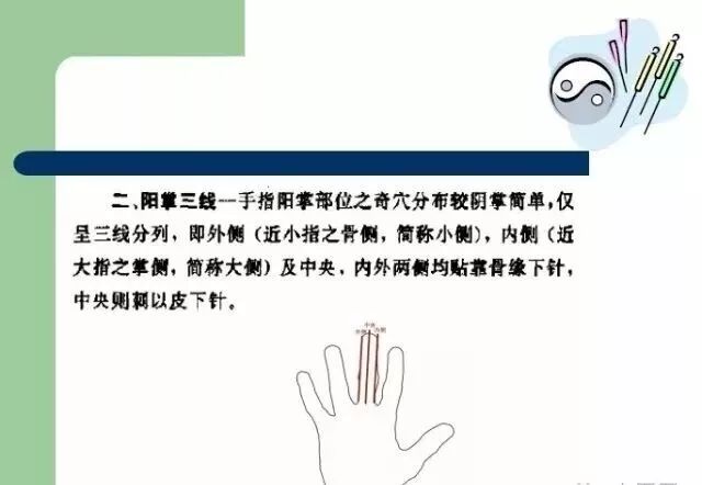 董氏奇穴的穴位分布确实是呈区段呈体系,脉络清晰有法可循。他跟我们十四正经的阴阳相贯 如环无端是有着一个很大的差别的。例如董氏奇穴在手掌上创新穴位比较多,如阴掌五线和阳掌三线。