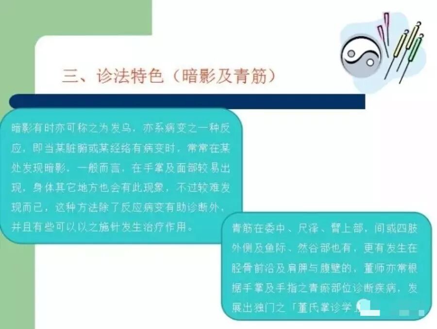董氏掌诊别具一格,李国政先生在《台湾董氏针灸真传掌诊法》里面提到,董公诊病首先看掌诊,再看面诊,掌诊是董氏奇穴治疗的第一步。还有一个就是青筋和暗影。青筋和暗影呢,一方面是病变部位的特定反应区,有什么样的病变,就会在特定的区域出现青筋和暗影,同时青筋和暗影又是我们治疗所选取的部位,董公有些奇穴的发现就是根据暗影来的。