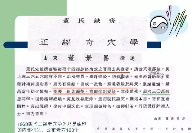 董氏奇穴是在1973年首次出书公开的,但是在这之前,是有一部油印讲义,就是董氏针灸的《正经奇穴学》。该书是董景昌先生亲自所撰述的,而且他在书里面写了一个序言,他说董氏奇穴是先祖所传,而且是自成一派,跟十四正经有所不同。后面由于遭遇到战乱,所以他祖传的书籍毁于一旦了。不过幸而先祖对他面授了口诀,董景昌前辈牢记这些要诀,再经过了三十多万人的病例验证,再把这奇穴又再现了出来。所以从这一段序言里面我们可以看出来,是董景昌前辈他自己根据要诀在经过了大量的临床验证也就是病例验证以后,再创制出来的董氏奇穴。