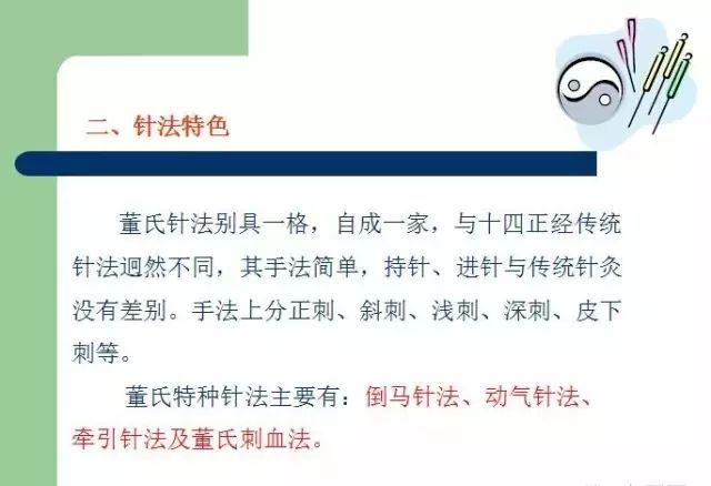 董氏针法别具一格,而且自成一家,与十四正经的针法不同。传统的针刺操作中,在提插捻转手法的基础上发展出来各种各样复式手法,学习和掌握都有一定难度,但是董氏奇穴的针刺手法就比较简单。