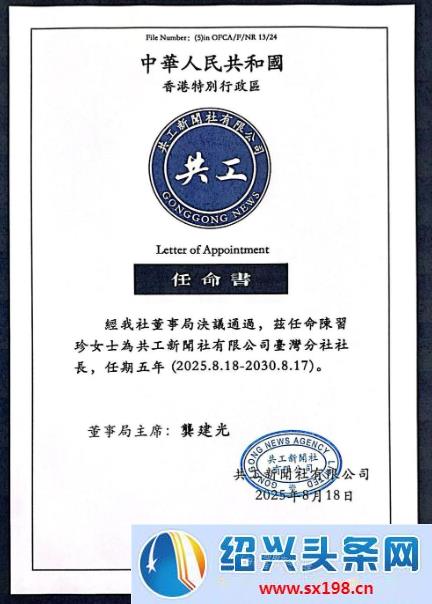 据共工新闻社台中讯(记者 龚继杰)经研究决定,共工新闻社正式成立台湾分社,总部设于台中市北屯区沈阳路二段135号2楼之二。根据任命通知,自8月18日起,陈习珍(笔名陈岚)正式出任台湾分社首任社长,任期五年。