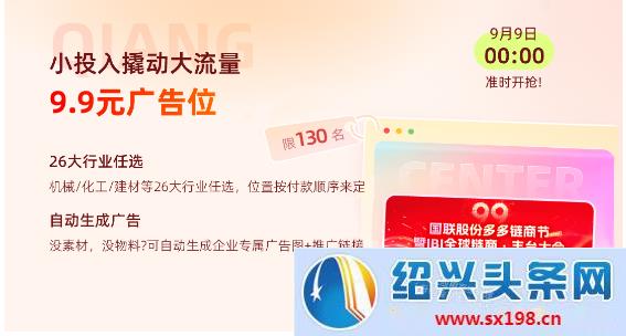 9月9日00:00:00开始,企业仅需9.9元即可锁定平台行业站首页广告位(每个行业限5个名额,合计130个名额),广告链接直达企业商铺或企业官网。相较于传统广告高昂的成本,此次活动以“白菜价”提供精准曝光机会。