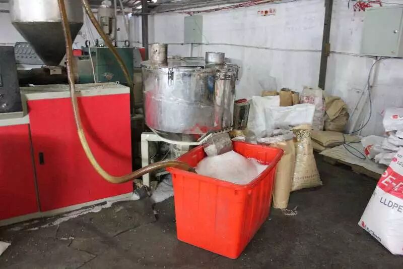 而在其中还堆放着数袋堆着回收来的废旧塑料和已粉碎好的塑料。以便他们进行“二次加工”。