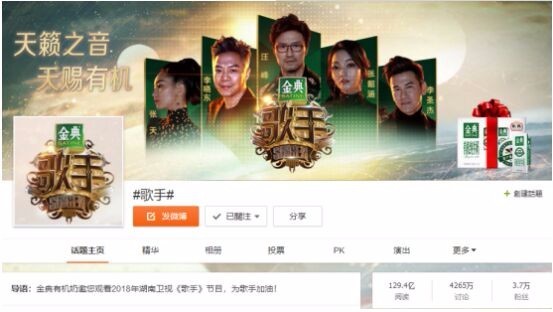 《歌手》节目以其超高关注度和持续好评推动金典有机奶走向品牌传播新高度,金典有机奶致力于打造中国“最好的牛奶”,零添加无污染限定原产地牧场为标准也在节目口播、场景植入中被观众潜移默化接受。