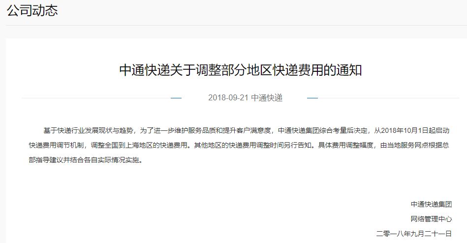 “从2018年10月1日起启动快递费用调节机制,调整全国到上海地区的快递费用。其他地区的快递费用调整时间另行告知。具体费用调整幅度,由当地服务网点根据总部指导建议并结合各自实际情况实施。”