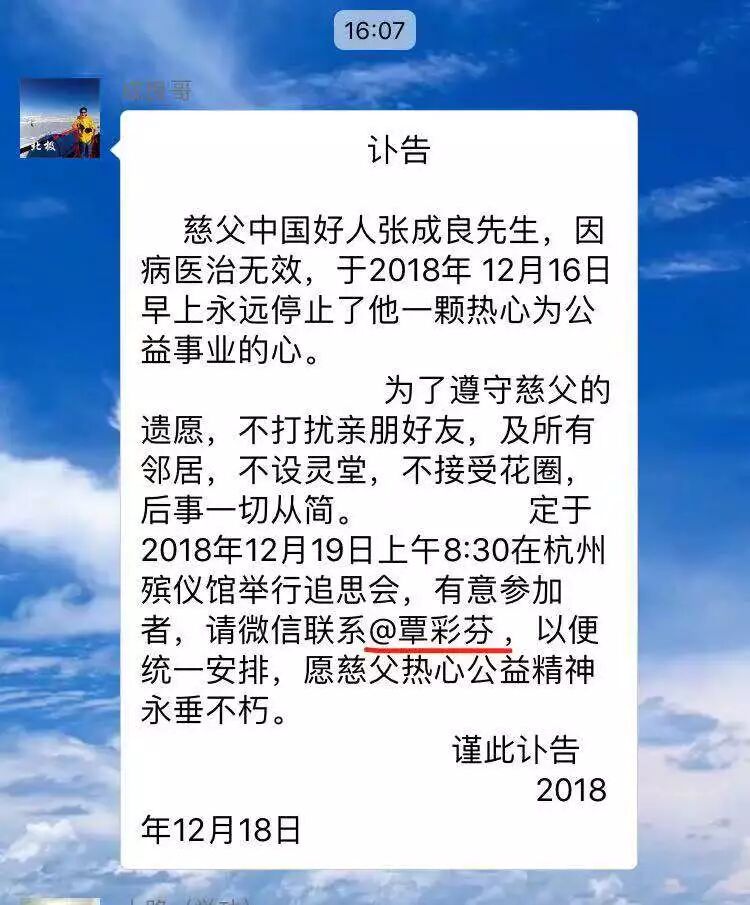 讣告发在“成良微公益面馆义工群”里,是由张成良的个人微信“成良看世界”发出的,因病医治无效。义工群里不少人都表示不敢相信。因为此前,关于他生病的事情,一点征兆都没有。