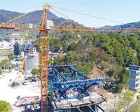 日前,在杭绍台铁路新昌段左于江特大桥施工现场,大型运输车辆不断输运着建筑材料,吊机臂来回摆动将钢筋.. |