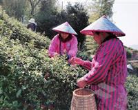 日前,在陈宅镇开化村的诸暨市东珍生态农业茶园基地,茶树尾梢刚刚吐绿,20多位采茶女就头戴斗笠、腰挂竹.. |